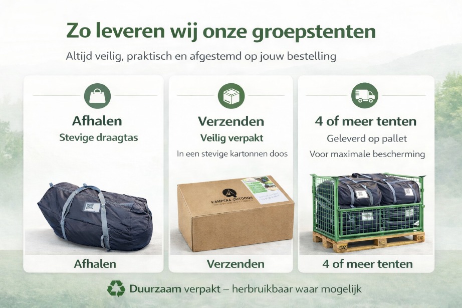 Deze groepstent kan eenvoudig bij u thuis afgeleverd worden. Huur jouw groepstenten bij Kampera Outdoor.